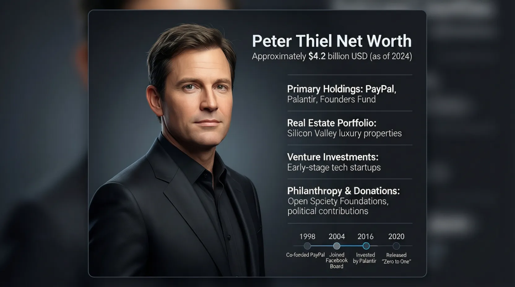In summary, Peter Thiel’s wealth is the product of strategic investments, entrepreneurial ventures, intellectual property, and advisory roles, making him one of the most financially successful and influential figures in Silicon Valley.